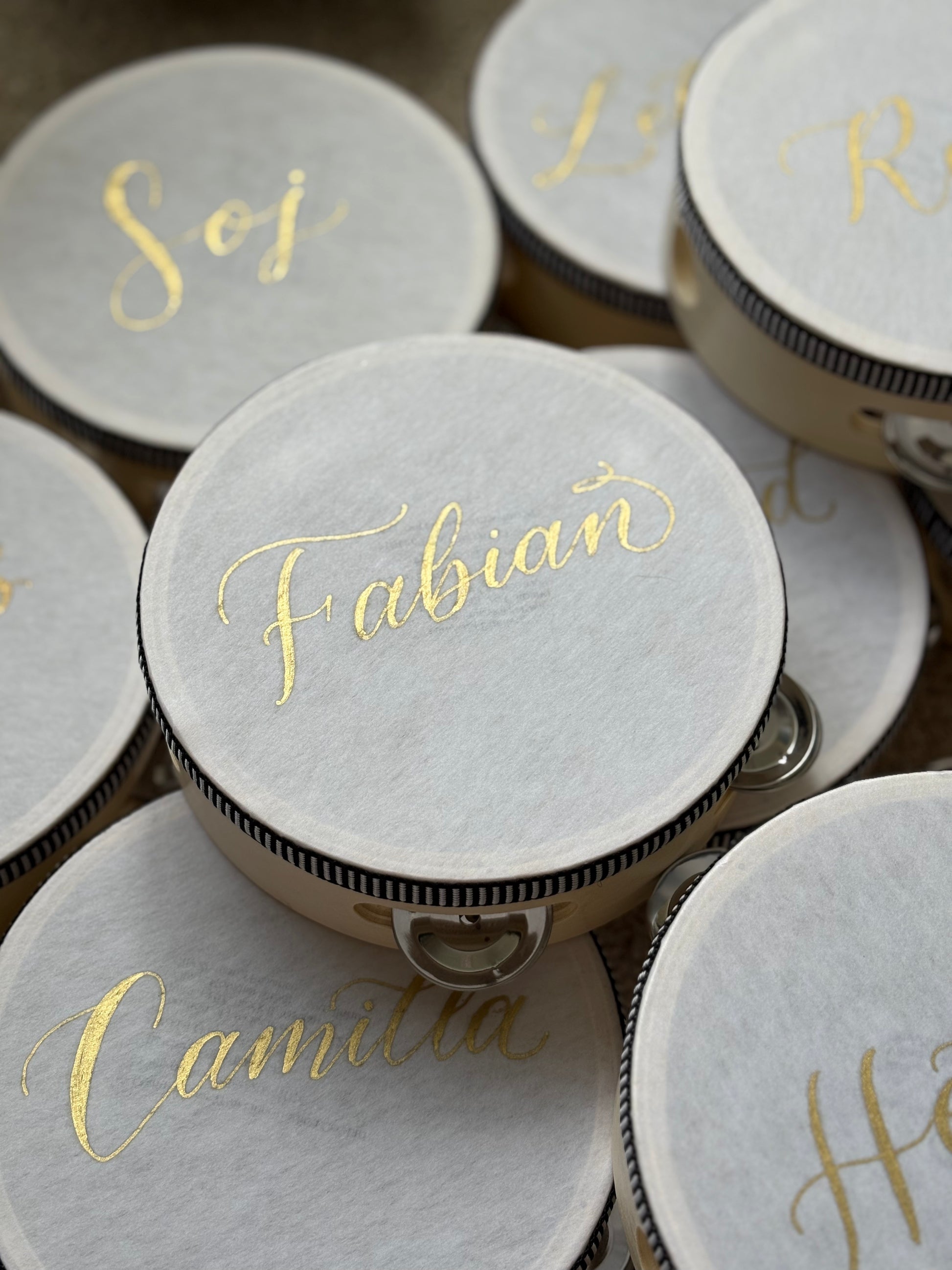 Each tambourine features exquisite handwritten calligraphy, adding a refined and memorable touch to your celebration. These tambourines serve as both beautiful keepsakes and functional accents to enhance your event!