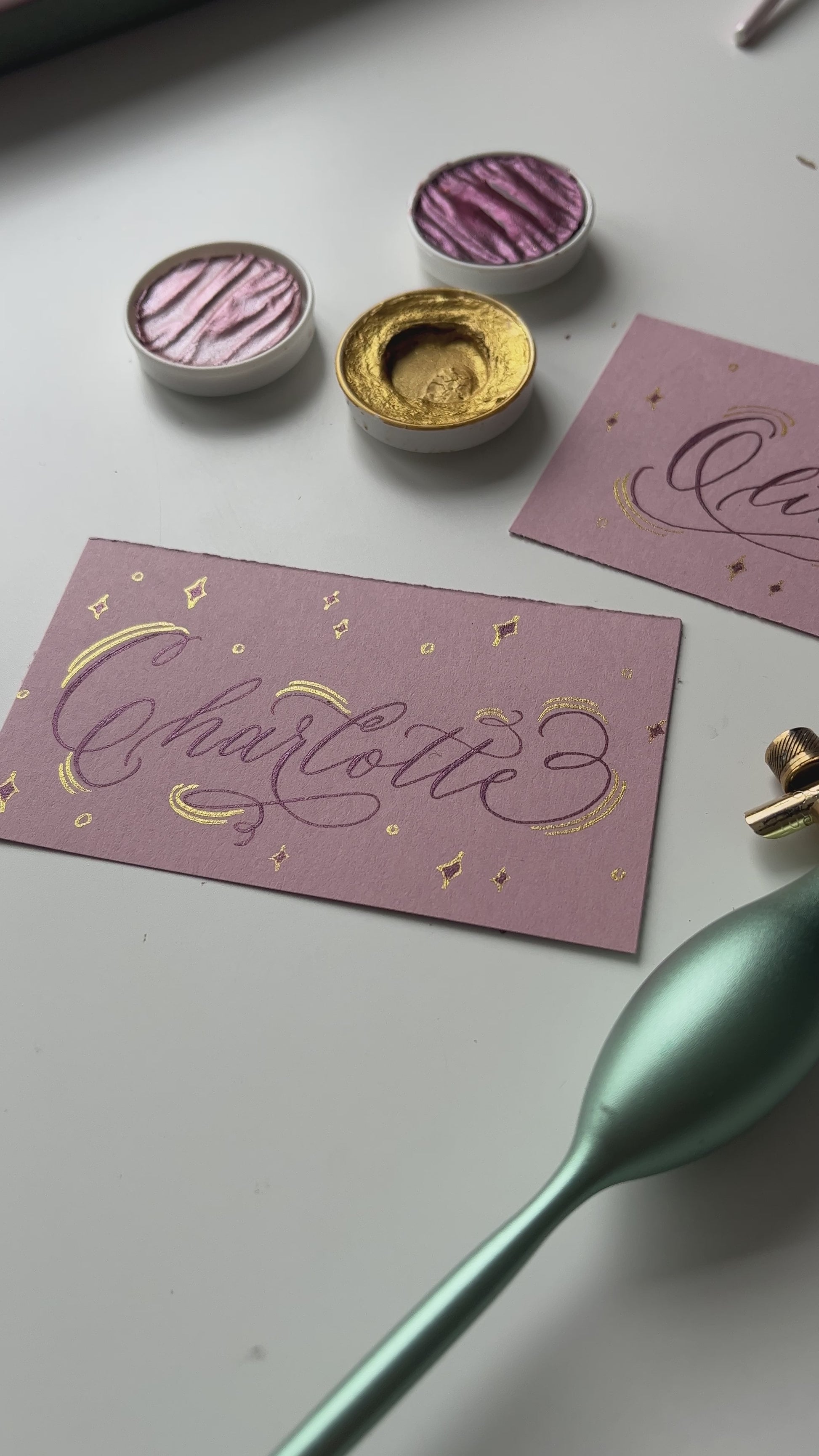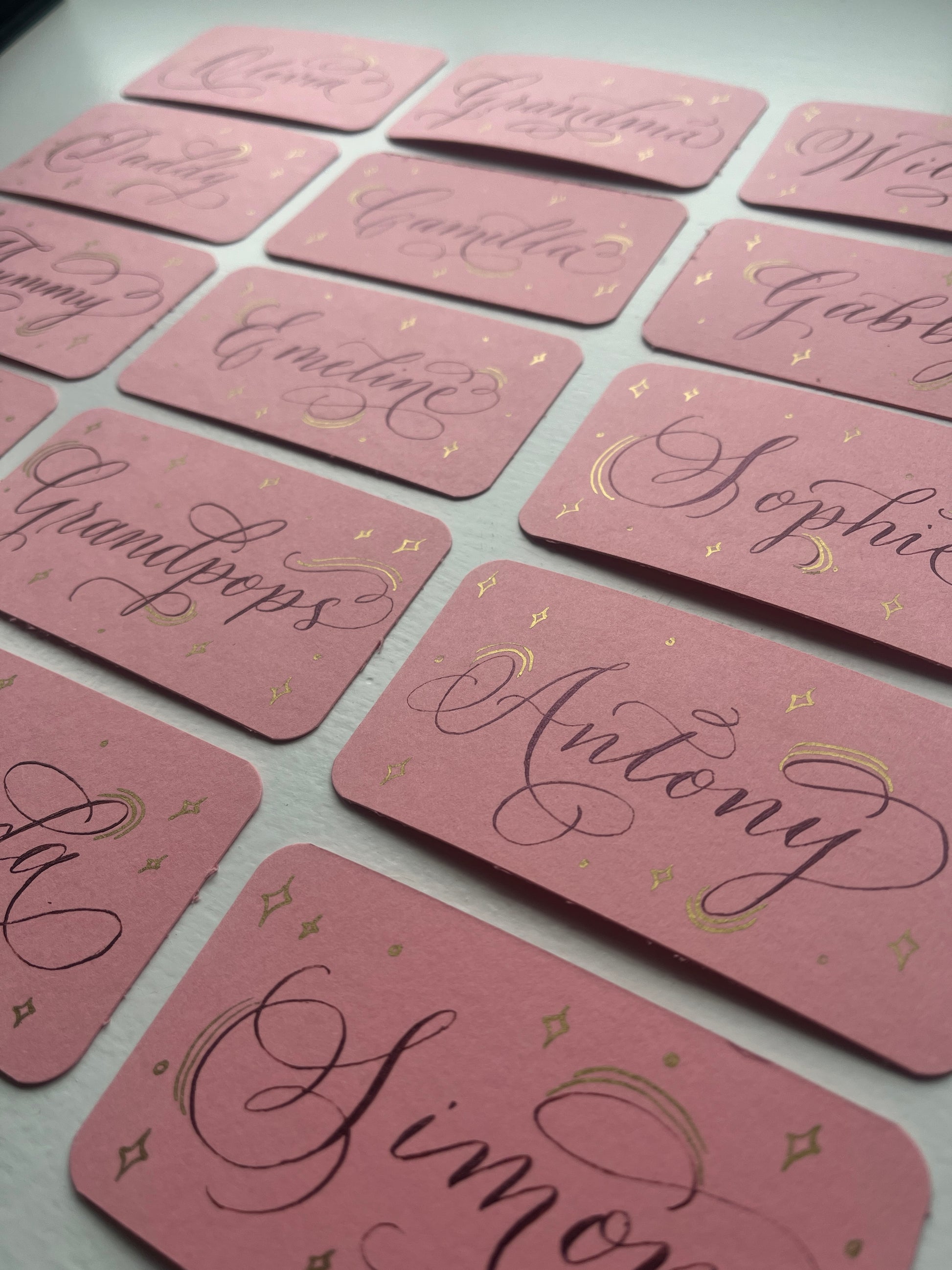 Each name card is handwritten with luxurious metallic ink, adding a touch of elegance to your event.